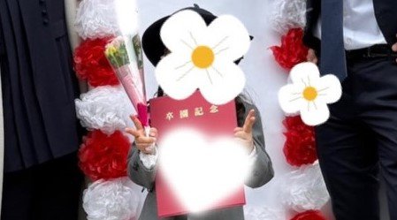 そんな夫婦の間には、6歳長女の姿が。黄色の花束と「卒園記念」と書かれた赤色の証書を抱えています。小さな手でカメラに向かってダブルピースを見せ、なんとも幸せな雰囲気あふれる、素敵なカットに仕上がっています。