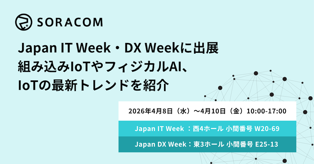 株式会社ソラコム(本社:東京都港区、代表取締役社長 CEO 玉川憲)は、2026年4月8日(水)から4月10日(金)まで東京ビッグサイトで開催される「Japan IT Week【春】」および「Japan DX Week【春】」(主催:RX Japan)に用途別に体験できる2つのブースを出展することをお知らせします。