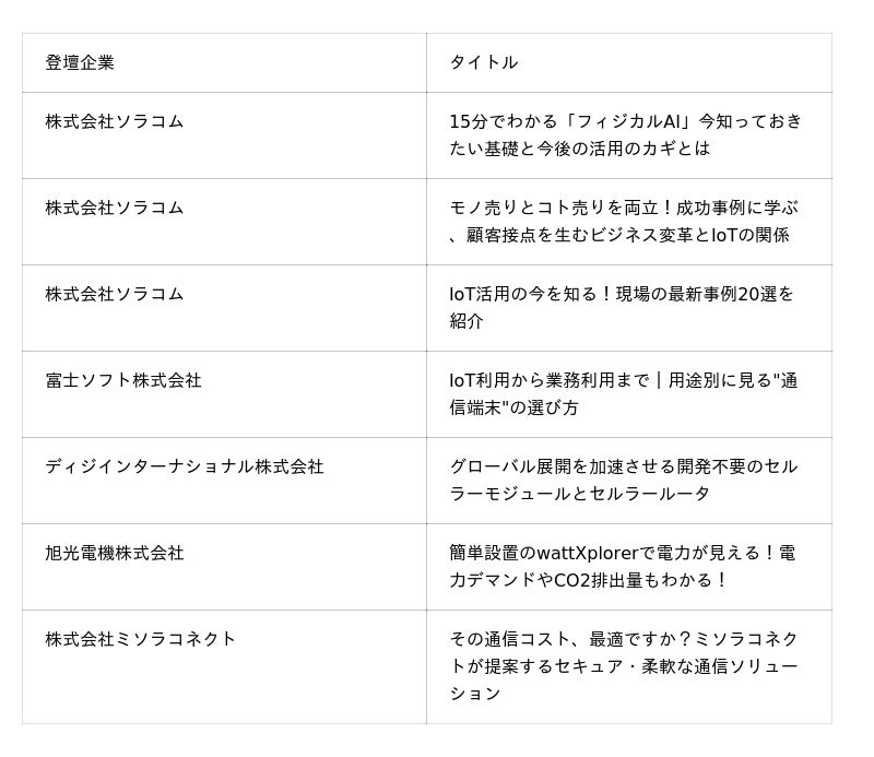 本出展では、製品や設備に通信を組み込む「モノのサービス化」や、AIによるモノの自律制御(フィジカルAI)といった最新トレンドをテーマに、これから必要となるIoT通信の要件や付加機能、現場で活用が進むIoTの実践事例を紹介します。