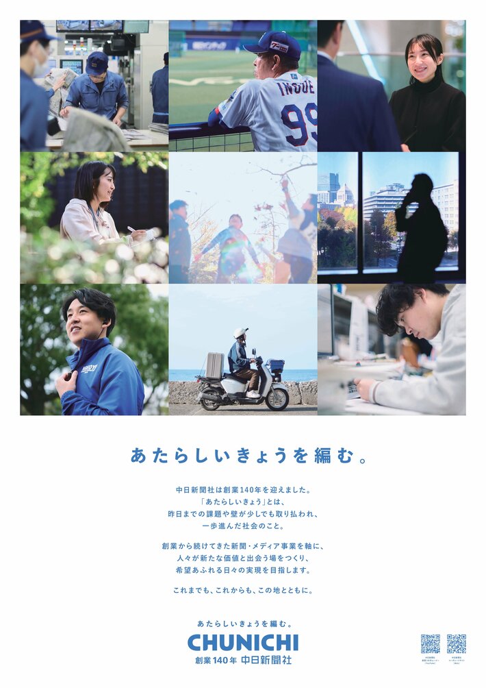 新聞事業にとどまらず、中日ドラゴンズの井上一樹監督をはじめ、グループの多様な事業に携わる人々の姿を通じ、新たに策定したタグライン「あたらしいきょうを編む。」に込めた思いを表現しています。