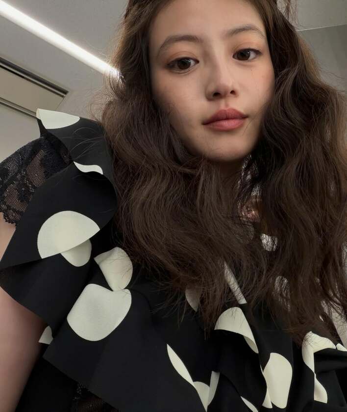 黒地に大きな白のドット柄があしらわれた、ゆるやかなシルエットの衣装が目を引きます。長めのウェーブヘアを下ろし、やわらかく微笑む姿が印象的です。
