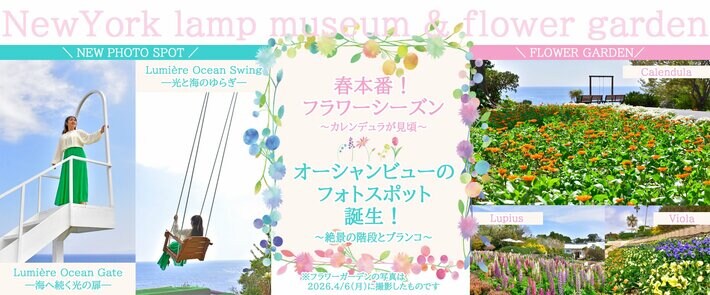 ニューヨークランプミュージアム&フラワーガーデンでは、オーシャンビューの岬付近に植栽した約2,500株のカレンデュラ(キンセンカ)が見頃を迎え、一面を鮮やかなオレンジ色に彩っています。そしてこの春、カレンデュラが咲き揃う岬の先端付近に、圧倒的な美しさとスリルを誇る2つのフォトスポットが誕生いたしました。