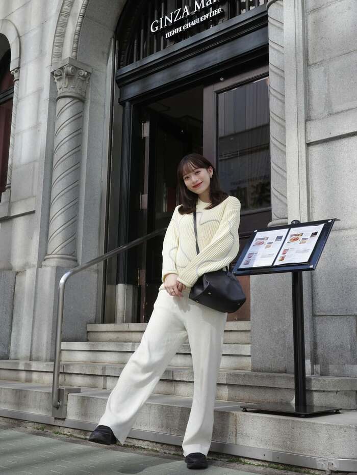 白のパンツに、春らしいパステルイエローのニットを合わせた由布さん。黒スニーカーと黒のショルダーバッグで、シンプルながら爽やかで統一感のあるコーディネートに仕上げています。
