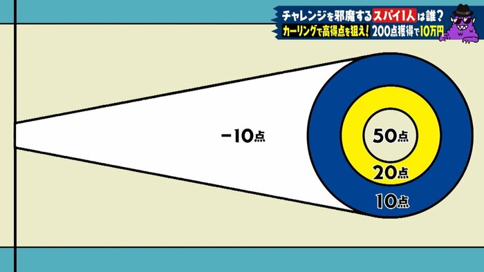 円の手前がマイナス10点。円の外側から中央に向かって10点、20点、50点。4人1組で前半・後半2分ずつ行い、合計200点以上とれればチャレンジ成功です。