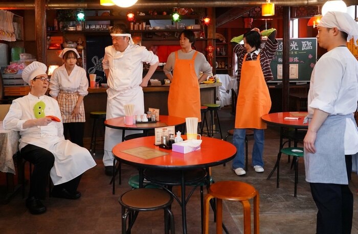 中華料理店のセットは、カウンター席とテーブル席が並び、こじんまりとした雰囲気。真っ赤なテーブルやレトロな柄のランプが印象的です。