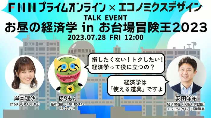 7月28日(金)12時より、フジテレビ開局65周年イベント「お台場冒険王2023 SUMMER SPLASH!」にて、フジテレビ系列28局が運営するオンラインニュースサイト「FNNプライムオンライン」とエコノミクスデザイン社によるトークイベント「お昼の経済学inお台場冒険王2023」を開催。