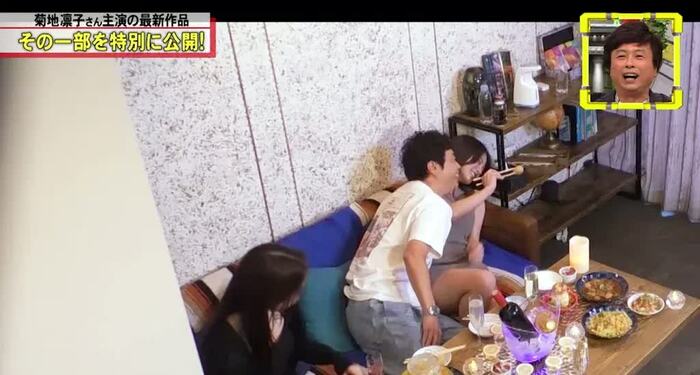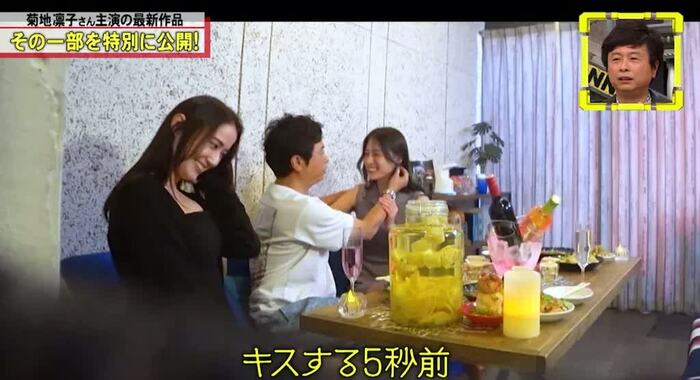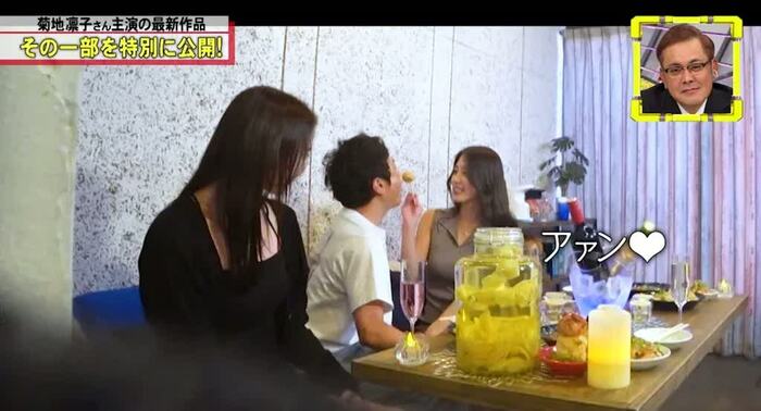 紹介された映像は、河本さんに似た男性と2人の女性。おでこをつけ、密着しながら、「下着は今日何なんですか?」「ちょっと難しい色かもしれない」「ピンクやったらええなーと思ってる」などと会話。