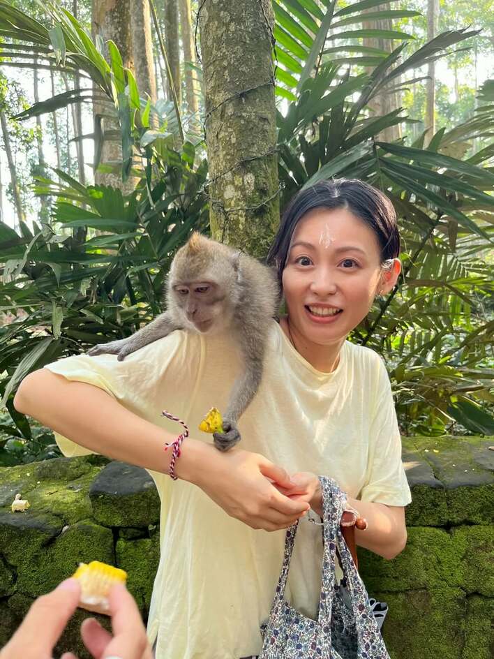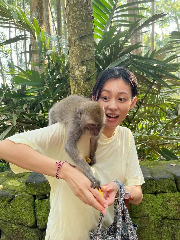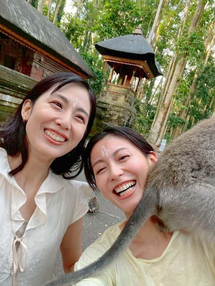 公開された写真を見てみると、木々が生い茂る大自然の中で、肩にサルを乗せ、少し驚いたような表情をした本仮屋さんの姿が。本仮屋さんはバリ島の観光名所・モンキーフォレストでサルへの餌やり体験を楽しんでいたようで、サルはバナナの皮の断片を持ち、本仮屋さんの背中側から大きく前に身を乗り出しています。
