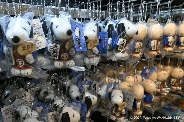 なかでも毎年人気だというのが、番頭に扮したスヌーピー、チャーリー・ブラウン、飛脚に扮したスヌーピーの兄弟・オラフの「番頭マスコット」と「飛脚マスコット」(各1980円)。スヌーピーにはちょんまげがついていて、とてもキュートです。