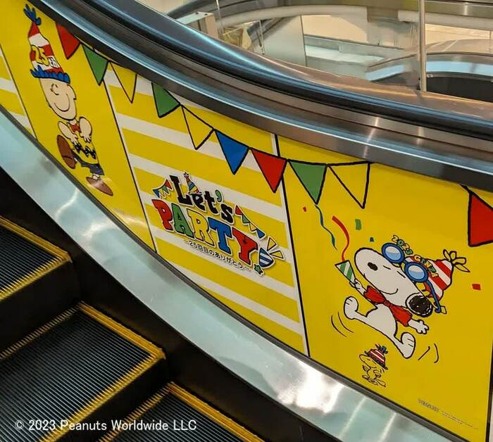 まず銀座三越本館1階のエントランスを入ると、スヌーピーとウッドストックがお出迎え。少し先に進むと、1999年の初回開催からの25回分のビジュアルアートが展示。さらに、エスカレーターにも、案内板の上にも、あちこちにスヌーピーと仲間たちの姿が見られ、ワクワク感が止まりません。