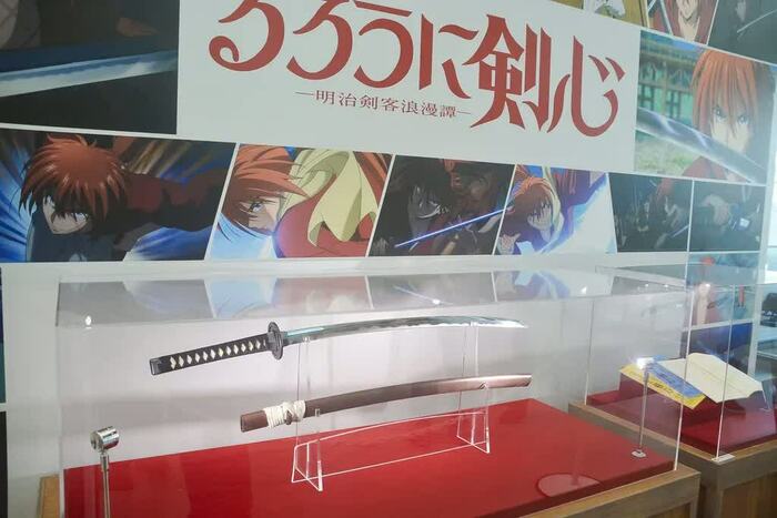 「逆刃刀」の模造刀や、作品のキービジュアルをはじめ、台本の展示など、“るろ剣”ワールドを楽しめます。