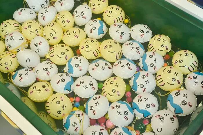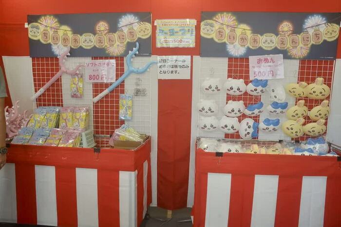 夏祭りの雰囲気に包まれた「ちいかわ縁日」では、ヨーヨー釣りも楽しめ、お面や、ソフトさすまたといったグッズの販売も。