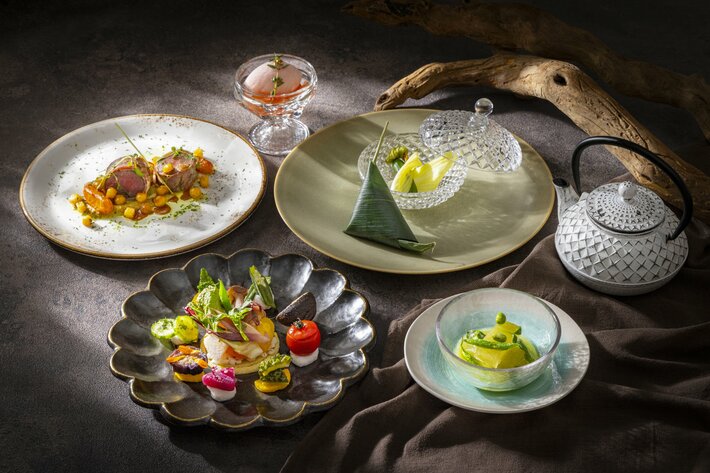 地域に根ざした食材を中心に、野菜や出汁の旨味を活かした身体にやさしいディナーコースをご用意。一皿ごとに、この土地の色彩や風景、記憶を映し出すようなストーリーをお楽しみいただけます。