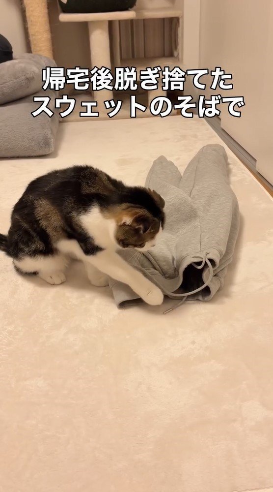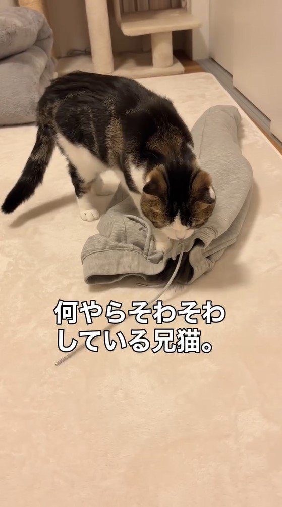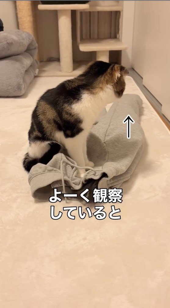 動画を見ると、床に置かれたグレーのジョガーパンツのウエスト部分を、ちょん…と優しく前足で触るこたろうくんの姿が!