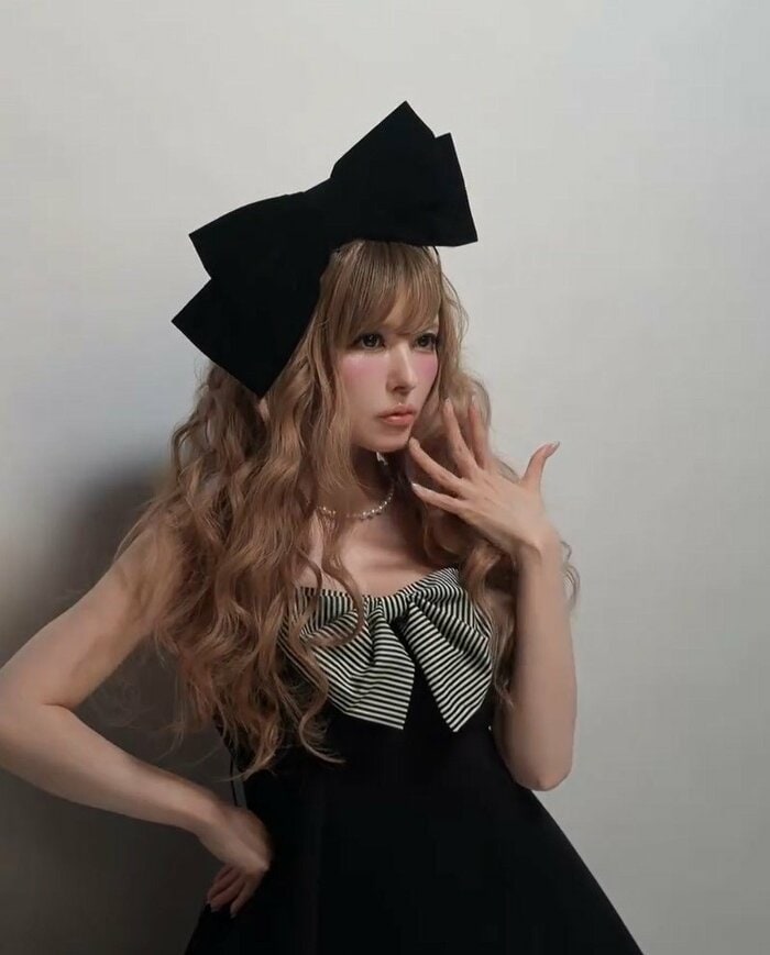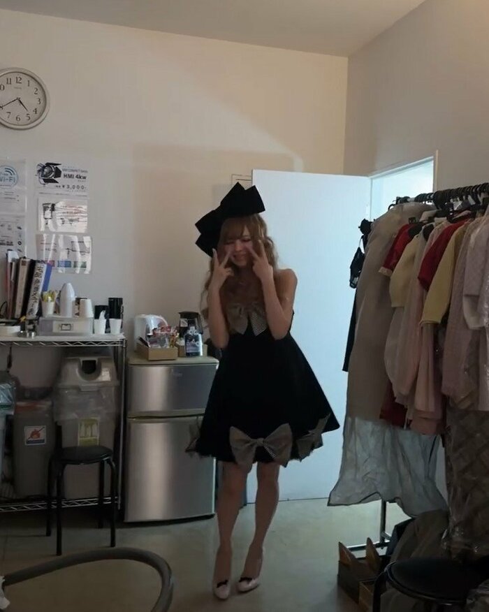 投稿の動画では、2009年当時のドーリーな姿を再現し、裾にリボンがついた黒いミニ丈のチュールワンピースに身を包み、しっかりと巻いた金髪ロングヘアで頭にも大きなリボンをつけ、撮影スタジオに登場!