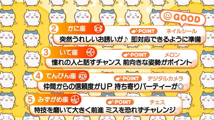 『めざましテレビ』で放送中の「ちいかわ占い」 テレビ放送がない日はお休みで、月~土:朝7時以降に更新予定です。