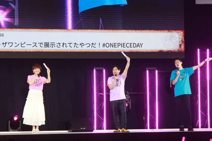 21日の「DAY1(前夜祭)」では、昨年公開された映画「ONE PIECE FILM RED」が“声出し”可能な形式での応援上映で復活。スペシャルゲストとして、ウタ役の名塚佳織さん、クラゲ海賊団役の霜降り明星(せいやさん、粗品さん)が登壇しました。