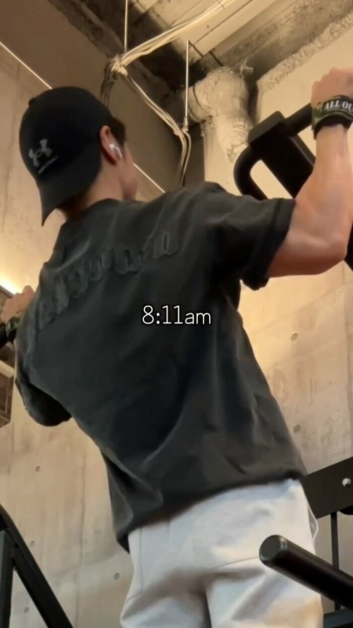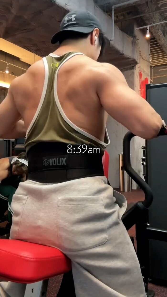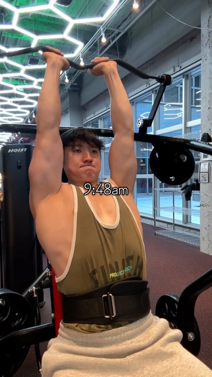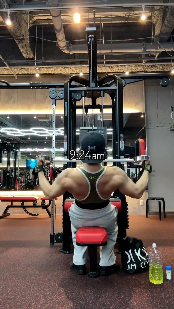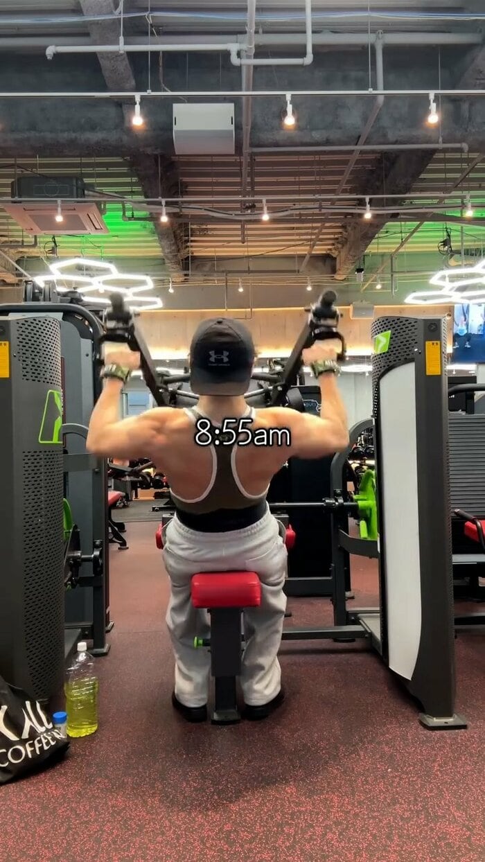 さらに午前9時24分には、再びラットプルダウンで、背中から肩にかけての筋肉をしっかりと収縮。