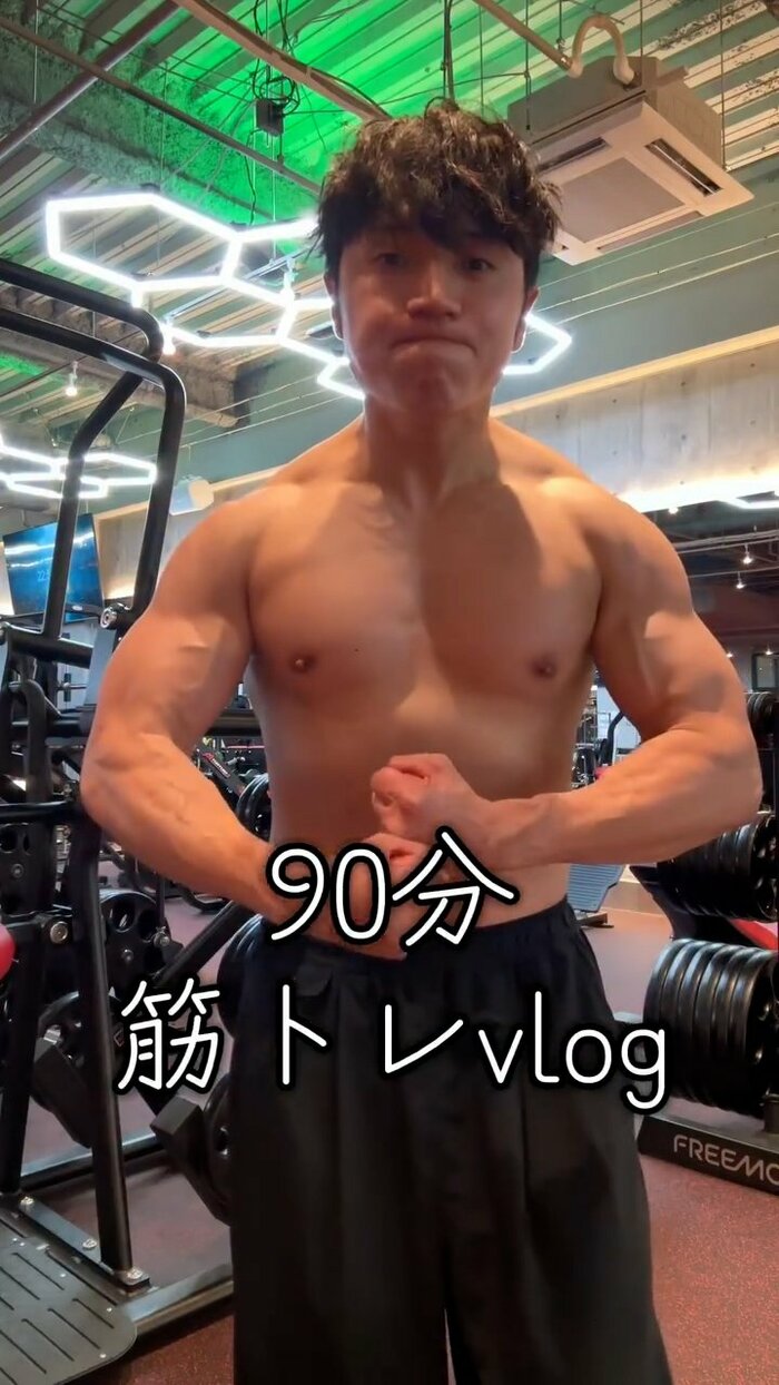 動画は「90分 筋トレvlog」というテロップからスタート。トレーニング器具が並ぶ本格的なジムで、上半身裸の西野さんがポーズをとり、圧巻の肉体を披露しています。