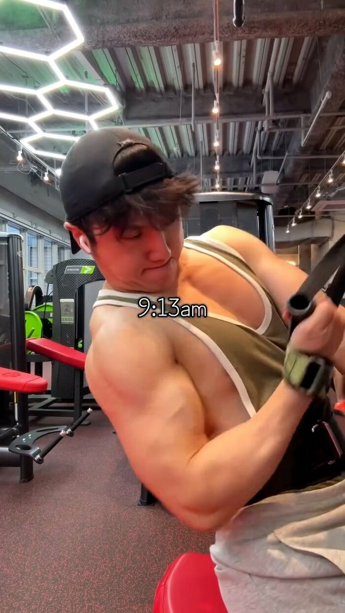 午前9時13分にはケーブルマシンの取っ手を握り、肘を曲げて上体を引く動作に挑みます。強い負荷を感じているのか、険しい表情で踏ん張る姿に思わず圧倒されます。上腕の筋肉は大きく盛り上がりすごい太さです。