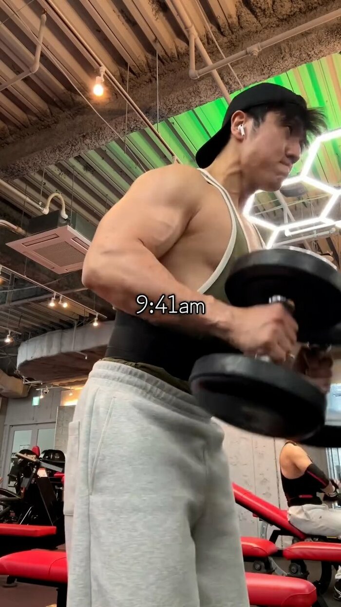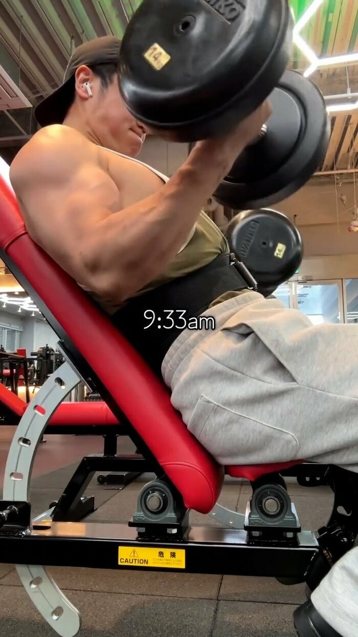 そして午前9時33分、角度のついたベンチに座り行うインクラインダンベルプレスで上半身をさらに追い込みます。限界に挑むように力む腕には太い血管がくっきりと浮き出ており、極限状態の緊張感が漂います。