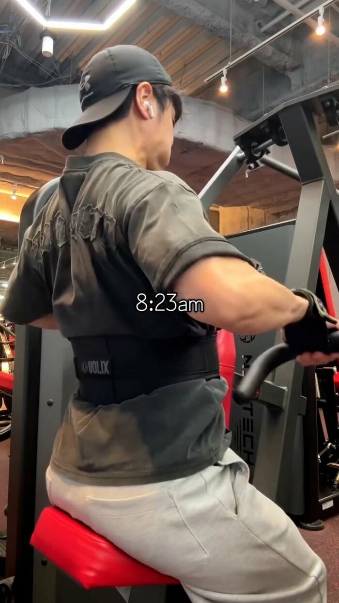 続いて午前8時23分には、マシンに座り背中の筋肉を鍛えるローイングマシンでのトレーニングへ。