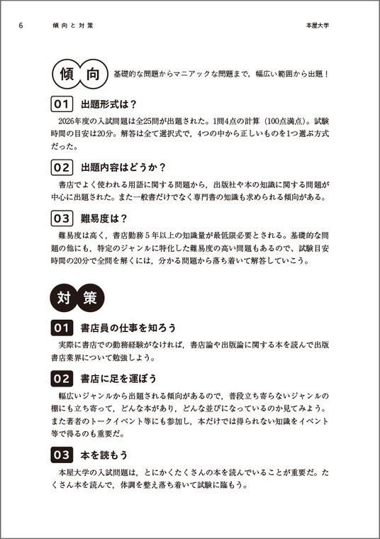 ハイスペックなスーパー書店員の早期育成を目的とした架空の大学「本屋大学」を目指す方のために「傾向と対策」「過去問と解答」「予想問題」「書店員の必読書」などを収録