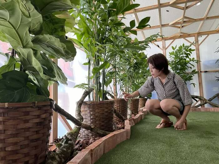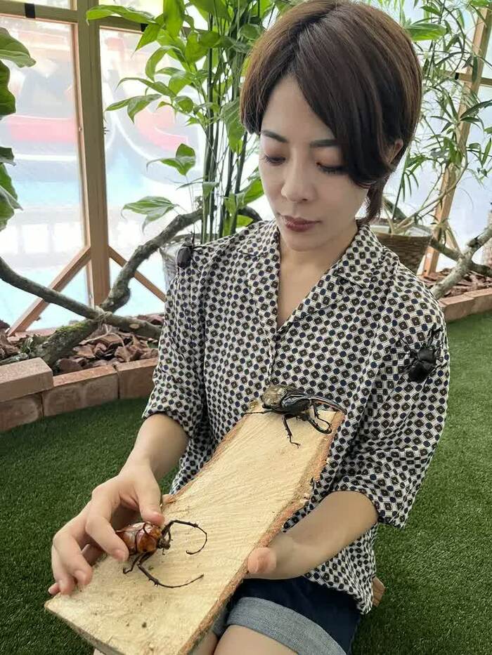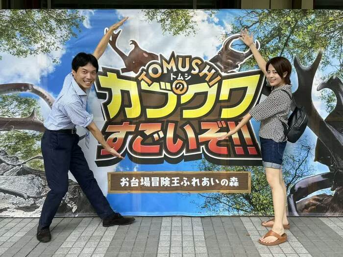 TOMUSHIのカブトムシやクワガタを堪能した篠原かをりさんは「こんな激レアなカブトムシやクワガタたちが常時新しいものがどんどん入りながら100体いるなんて、毎週来てもいいですね!」と、その可愛らしさに癒された様子でした。