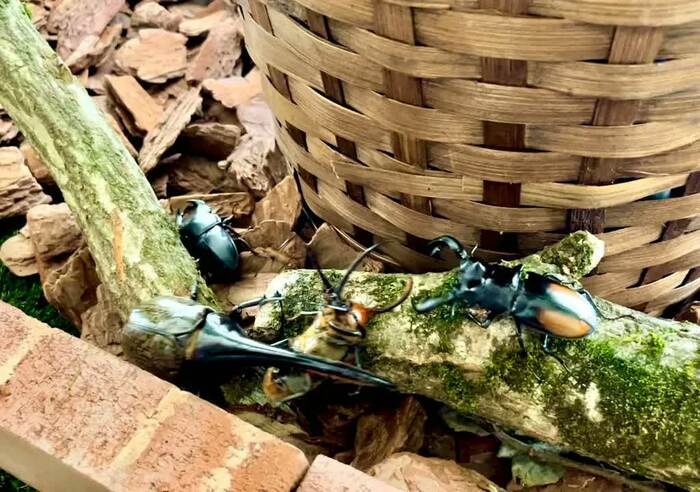 黄金色に光るカブトムシや大きな美しい形のはさみを持ったクワガタなど、思わず見とれてしまうほど。