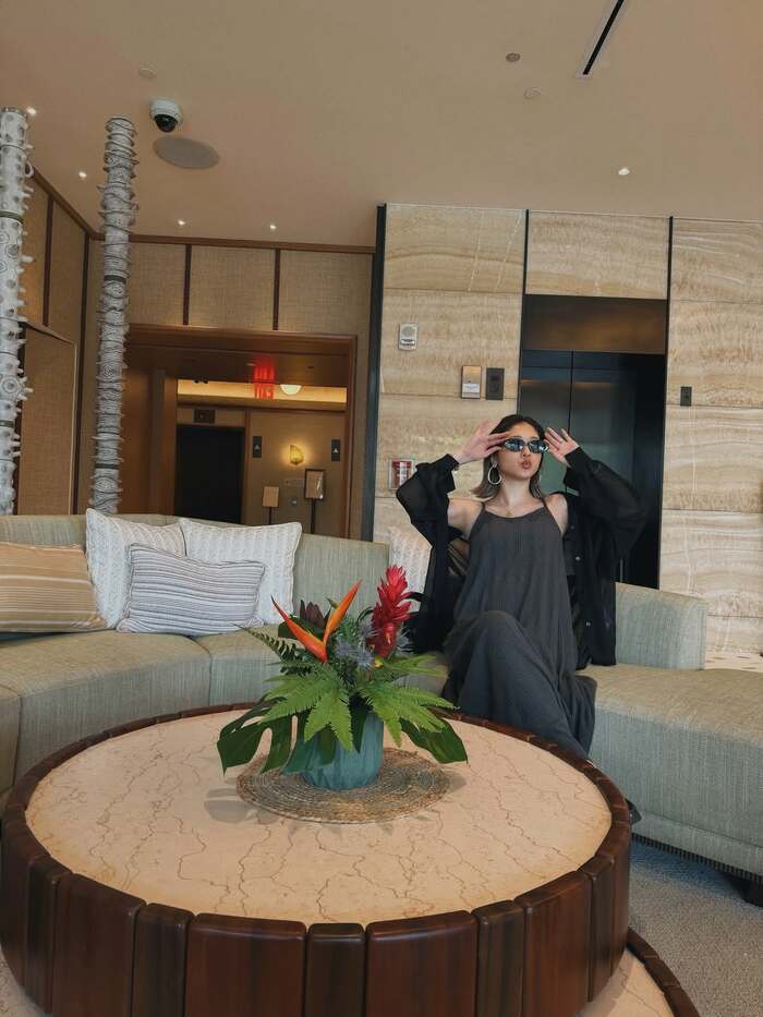 他にも、「今回泊まったホテルは初めましてのカライワイキキビーチ」とつづり、ホテルでのショットも公開。