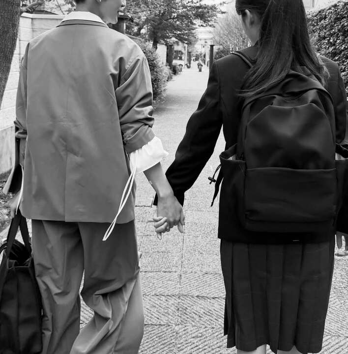 モノクロで投稿された写真には石畳の道を手をつないで歩く2人の姿が。