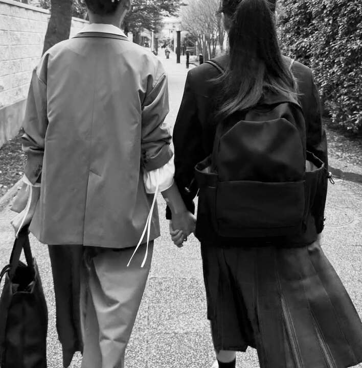 西山さんは袖口が淡い色のジャケットにパンツスタイル、長女は制服に大きなリュックを背負っています。しっかりと手を握り合い、何気ない会話を交わす様子からは、親子の深い絆が感じられる心温まる一枚です。