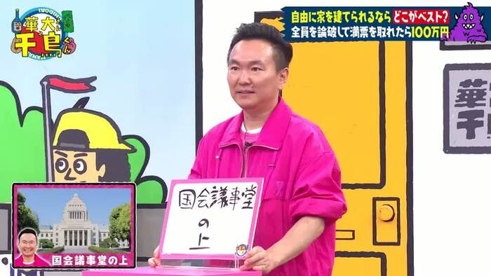 山内さんは「セキュリティもしっかりしてるし、国会議員とのコネクションもできる」ということで、「国会議事堂の上」と回答。