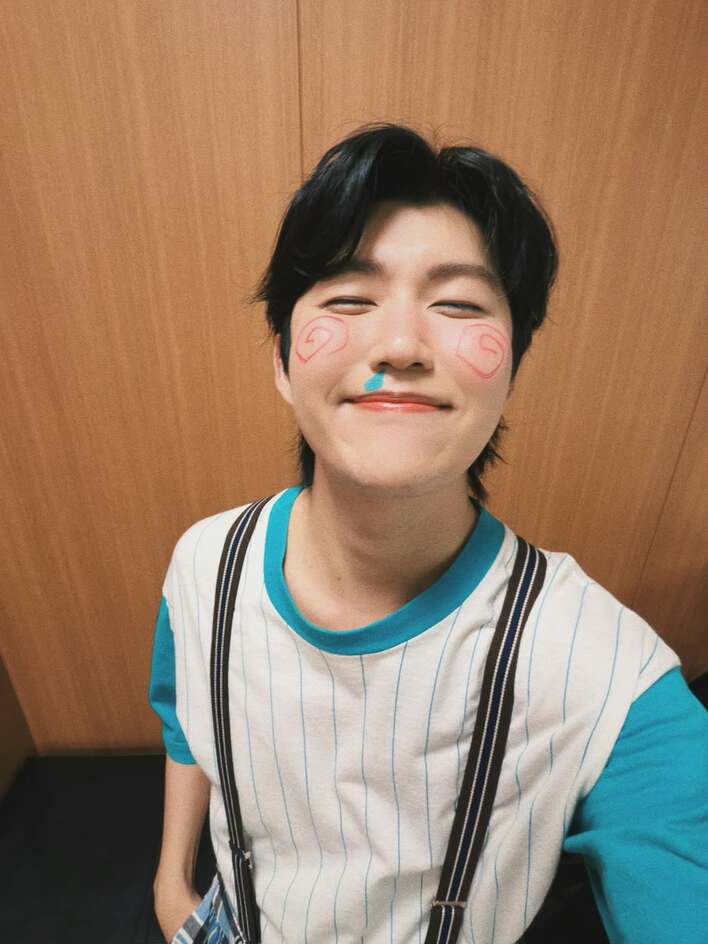 かと思いきや…鼻水を垂らし&ぐるぐるほっぺを施したメイク姿でにっこりほほ笑む若井さんも!?襟や袖がエメラルドブルーになったデザインのTシャツに、黒のサスペンダーを組み合わせたコーデになっていて、さきほどとは雰囲気がガラリと変わっています。