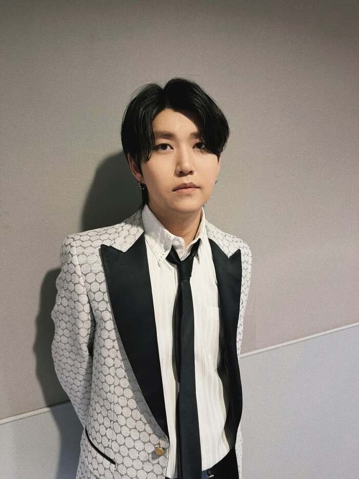 そこには、大きな白のドット柄が描かれたジャケットを羽織り、黒のネクタイを締めた若井さんの姿が。後ろで手を組みながら壁によりかかり、キリッとした表情を決めていて、クールな雰囲気がたっぷりです。