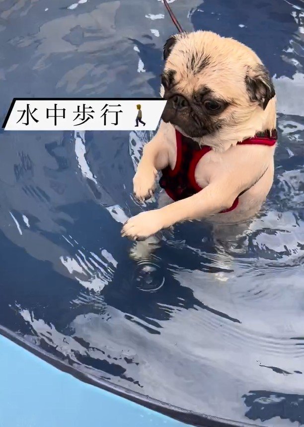 なんと、“水中歩行”を披露!後ろ足でまっすぐ立つと、トコトコと上手にプールの縁まで歩いていました。