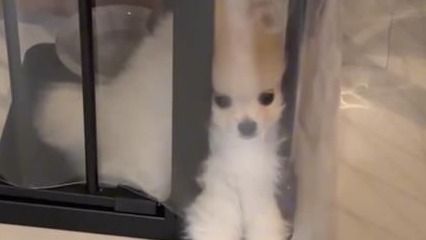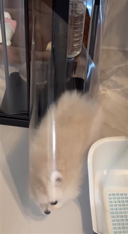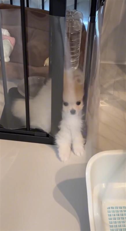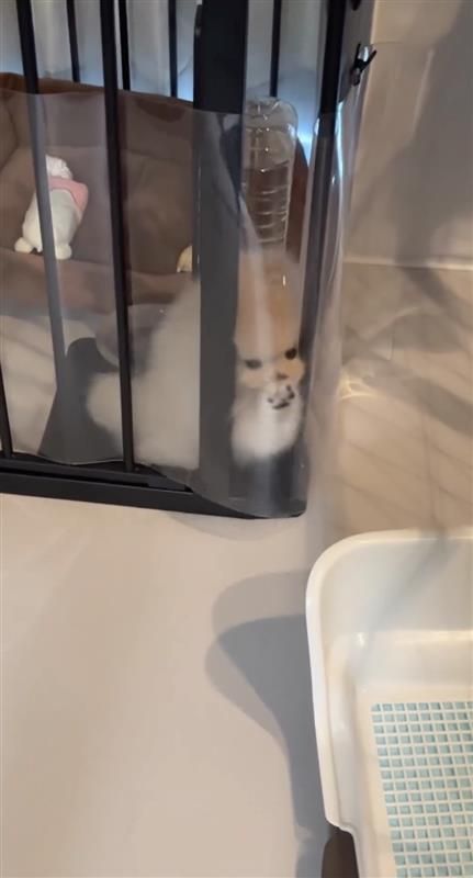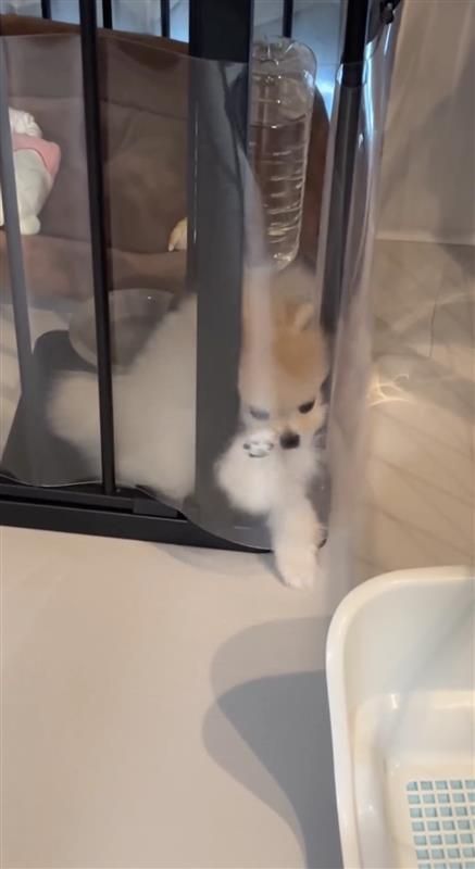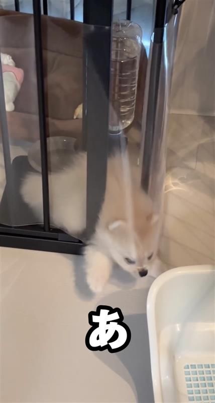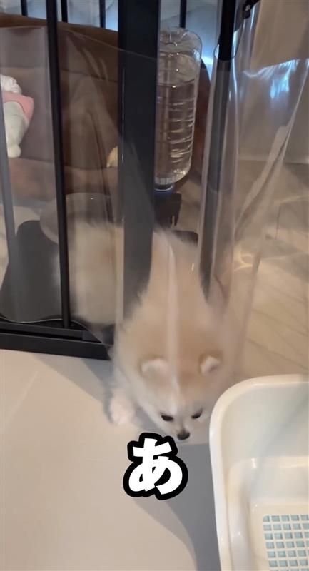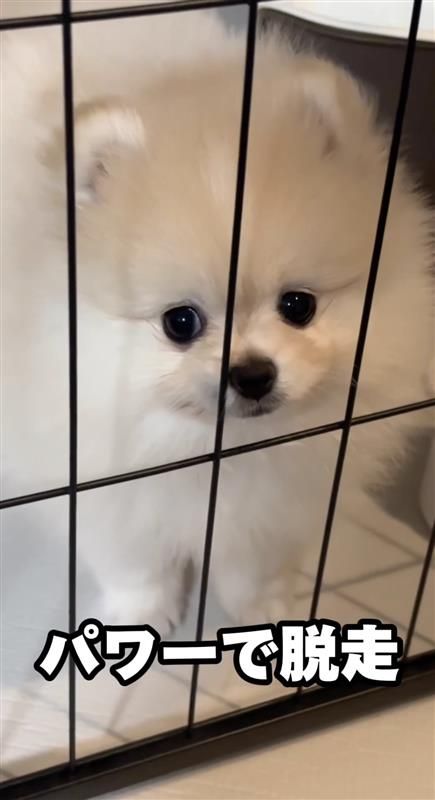 「2秒後脱走するポメラニアン」とつづられ公開された動画では、ケージから脱走を試みようとする雪若丸くんの姿が!小さな前足を使って、カリカリしながらケージにつけられた透明のシートを剥がそうとしますが…