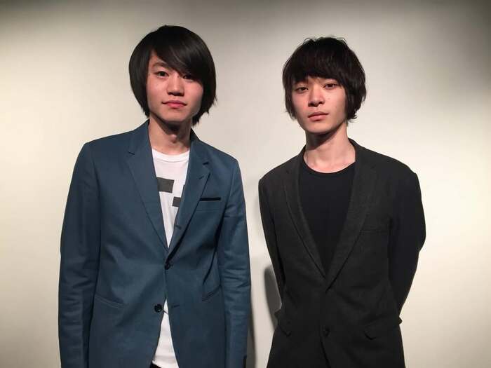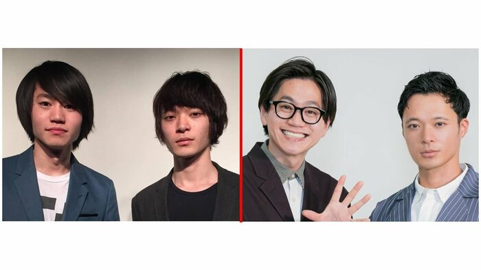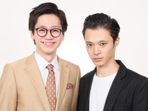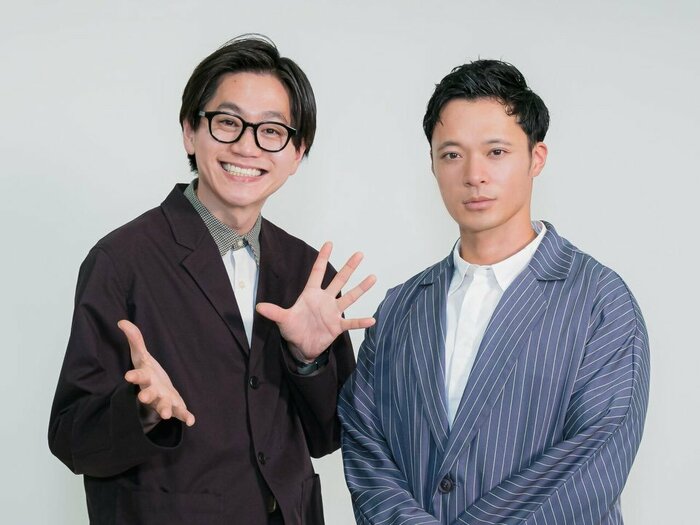 そこには、ブラウンのジャケットを羽織り、黒縁メガネ姿で手のひらを広げたポーズをする笑顔のたけるさん、爽やかなブルーのジャケット姿の相方・ショーゴさんは穏やかな表情で前で手を重ねてたたずんでいます。長年コンビを続けているからでしょうか、お互いにリラックスしているようです。