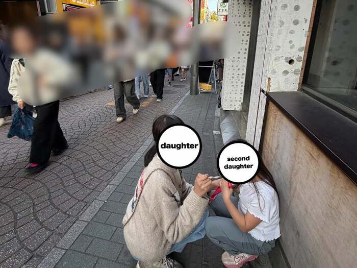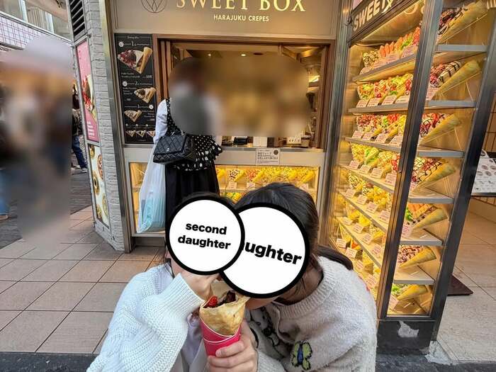 さらに続けて「歩きながら食べちゃうの可愛い♡」と、竹下通りを歩きながらクレープを食べる2人の姿を披露。お姉ちゃんが美味しそうに食べている姿を妹が羨ましそうに見上げているなんとも可愛い姿です。