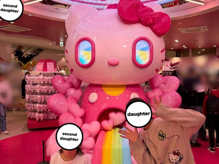 サンリオショップでは巨大なキティちゃん像の前で姉妹で並んで記念撮影。