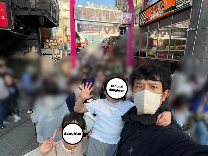 まず公開したのは色鮮やかなピンクのアーチが目を引く竹下通りの入り口での親子3ショット。黒いジャケット姿の庄司パパが、両脇の娘たちを優しく肩を抱き寄せるように密着しています。