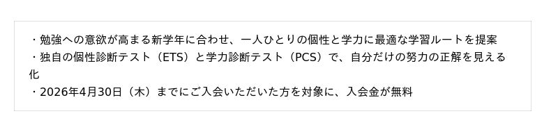 新学年への進級は、子どもたちにとって学習への意欲が高まりやすい時期です。その一方で、漠然とした不安を抱えたり、自分に合った勉強法が分からず足踏みしてしまったりすることも少なくありません。