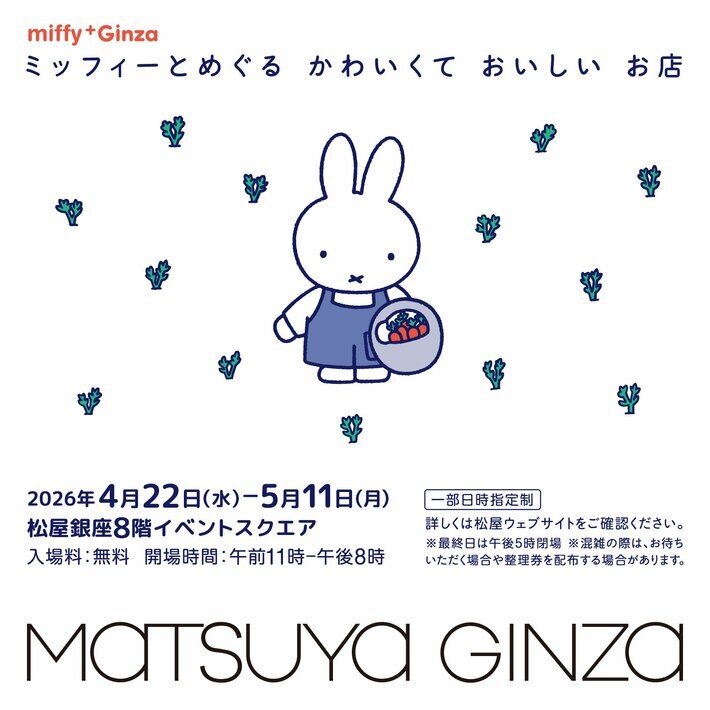 松屋銀座で、POP UP SHOP「ミッフィーとめぐる かわいくて おいしい お店 miffy⁺Ginza」が4月22日(水)から開催されます。 会場は一部日時指定制で、現在ライブポケットにて入場申込を受付中です。本リリースでは、POP UP SHOP概要、入場方法などを紹介いたします。