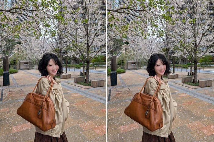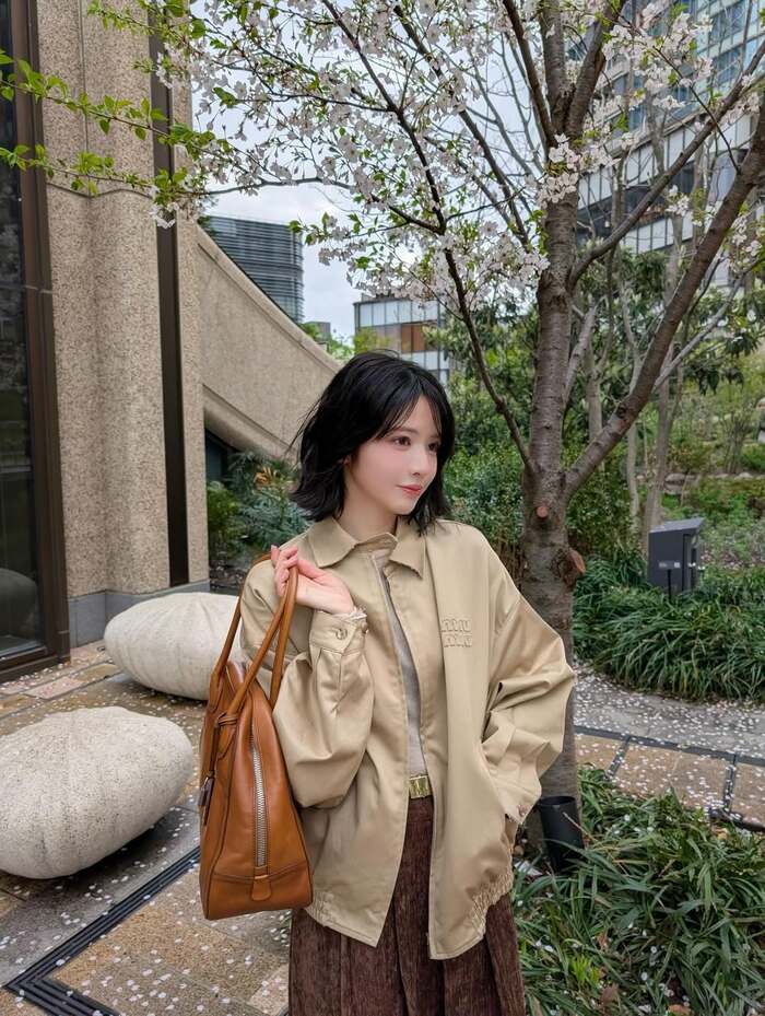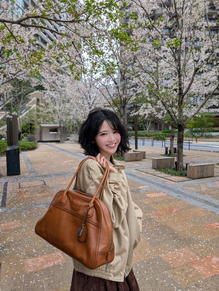 ベージュのオーバーサイズジャケットに茶色のミニ丈スカートを合わせた、季節感あふれる装いで登場した鎮西さん。ビルに囲まれた一角に咲く桜の木の下で、茶色のバッグを肩に掛けた姿を披露しています。