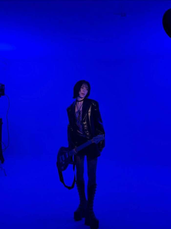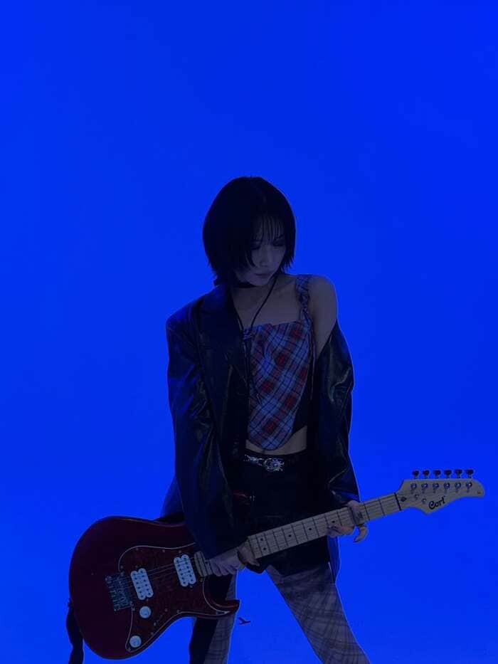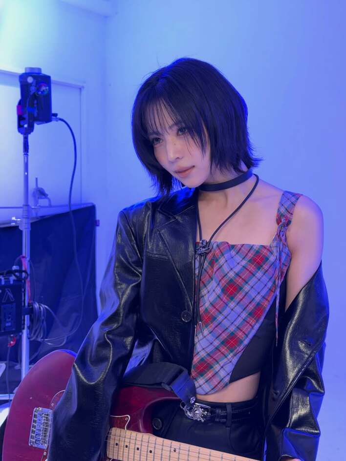 また、ギターを持って圧倒的オーラを放った全身ショットでは、黒のミニ丈スカートに柄付きのストッキングを合わせていることが分かります。