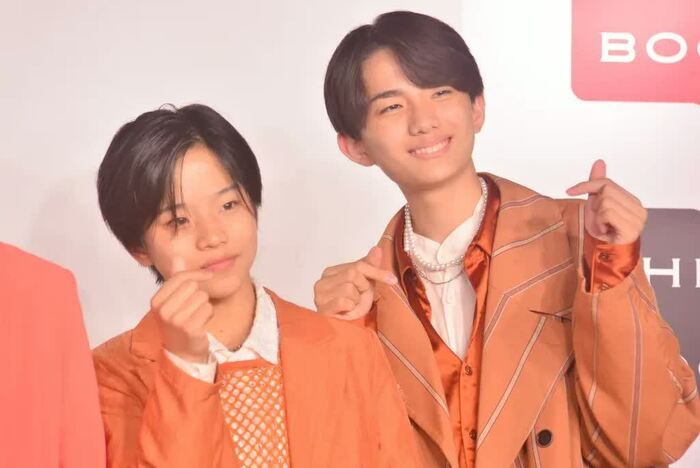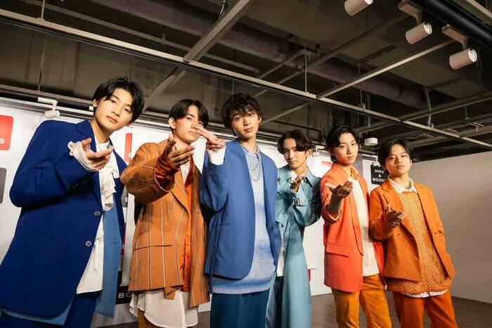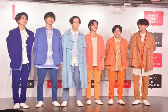 今回の衣装は、超特急・カイさんのプロデュースによるもので、「年齢=時間」をイメージしたグラデーションになっているそう。最年長の芳賀さんから最年少の高桑さんまでが一列になると、夕方から夜までの時間を表した色彩が並びます。