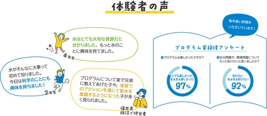 生活の中でどのように水を大切にできるかを子どもたちとともに考え、日々の行動変容につながるきっかけづくりを目指しています。また、水を支える技術にも触れられるよう、水処理のしくみを扱う実験も実施し、科学の面白さや発見の喜びを体感できる内容としています。