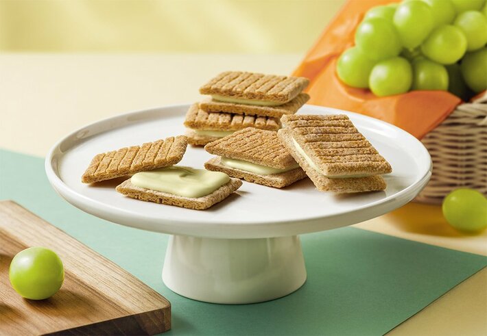 国産シャインマスカットの果汁を練りこんだミルキーなホワイトショコラ。みずみずしい国産シャインマスカット香る5種素材のシリアル生地でサンドしました。