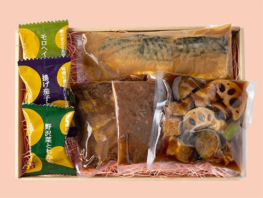 レストラン酢重正之で提供している「サバの味噌煮」や「彩り野菜と信州産豚肉の黒酢炒め」などの冷凍惣菜4種と、フリーズドライ味噌汁のセット。今晩はお母さんの代わりに家族で用意する、そんな母の日の食卓におすすめです。