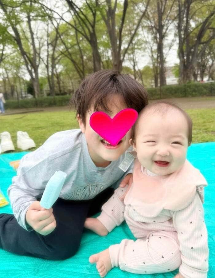 また、レジャーシートの上で、ピンクのベビー服姿の夢空ちゃんにアイスを持ちながら寄り添う幸空くんのショットも公開!